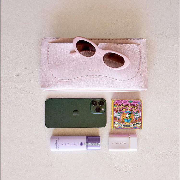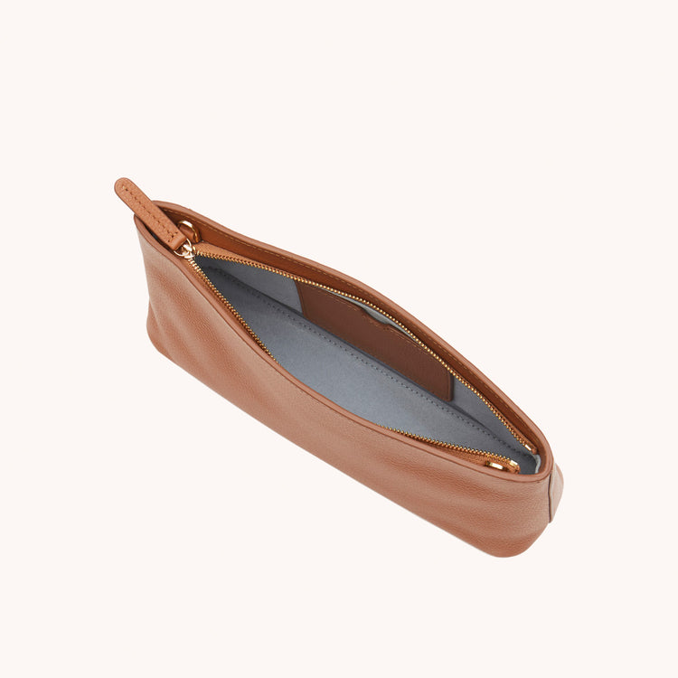 The Midi Atlas Pochette interior is lined with microsuede, fitted with a handy card slot, and the main compartment can fit any size phone. The exterior features a slip pocket on the front that can fit small essentials. The Midi Atlas Pochette can be slipped into the Midi Maestra, Cadence Shoulder Bag, or any larger bag for extra organization.